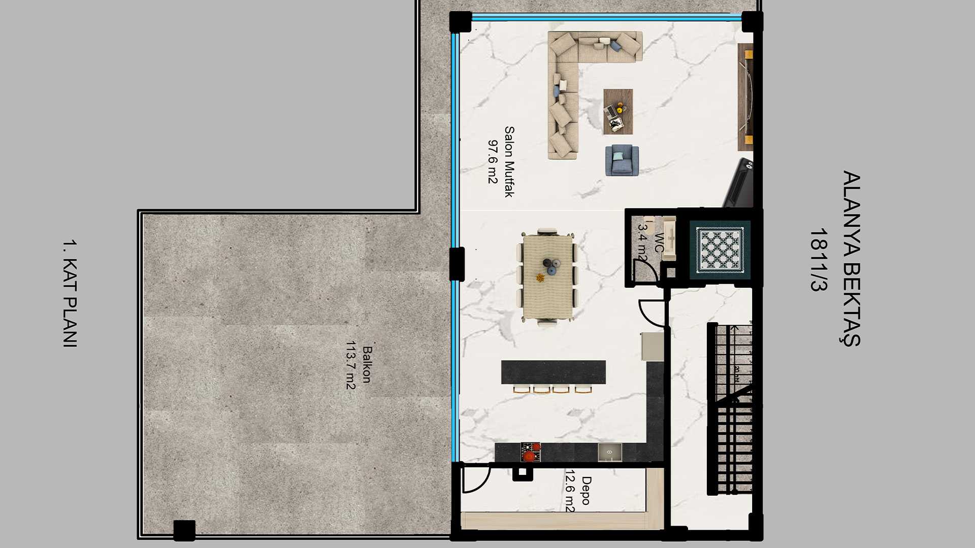 - Salon ve mutfak 97,6 m2
